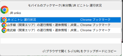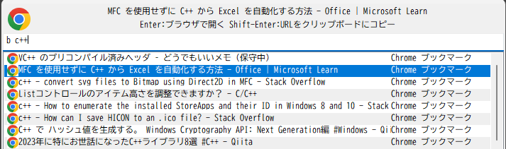 該当する候補を選択して実行すると、ブックマークに対応するURLをブラウザで開く。