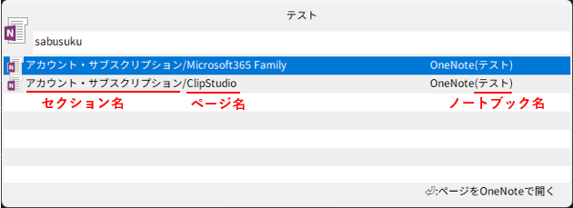 候補を選択し実行すると、該当のOneNoteページを表示できる