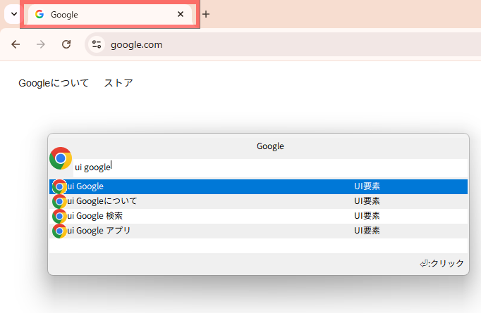アクティブなウインドウ上にあるクリック可能なUI要素について、テキストで要素を絞り込んでコマンドとして実行できる。