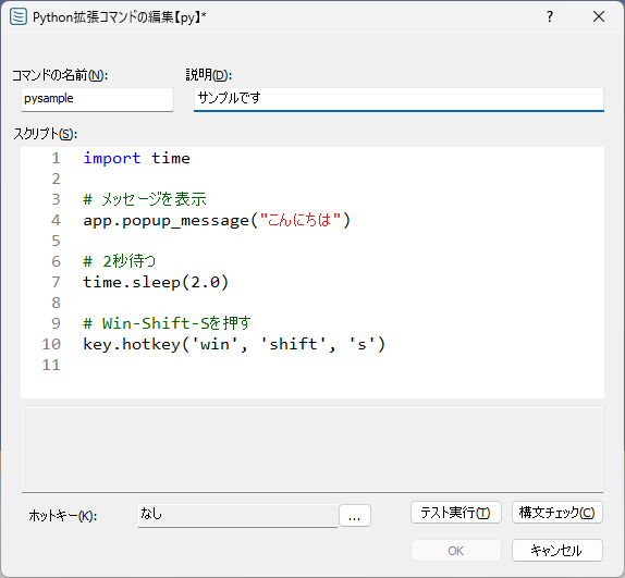 何のためのコマンドかを記載しておくための説明欄スクリプト実行する処理の内容をPythonスクリプトとして記述するテスト実行